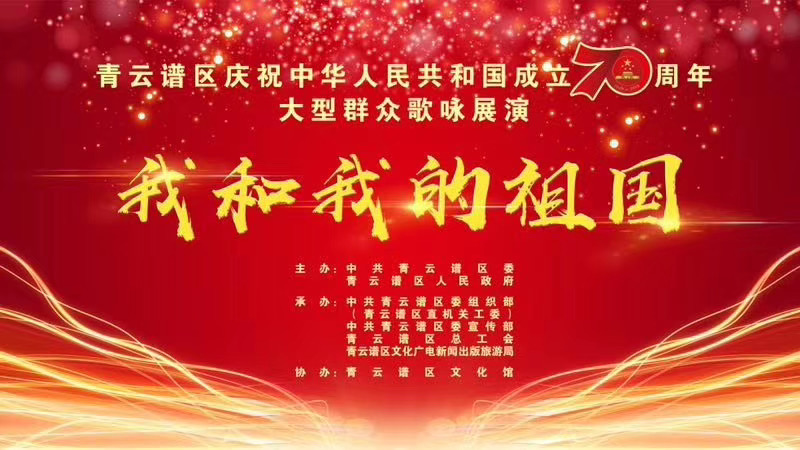 2019年9月25日下午,由中共青云谱区委、青云谱区人民政府主办,中共青云谱区委组织部(青云谱区直机关工委)、中共青云谱区委宣传部、青云谱区总工会、青云谱区文化广电新闻出版旅游局承办,青云谱区文化馆协办的“我和我的祖国”大型群众歌咏展演活动在区综合服务中心二楼大礼堂举行。